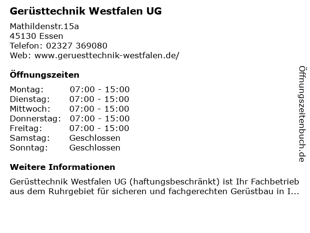 | Öffnungszeiten Gerüsttechnik Westfalen UG in Essen anzeigen | |
