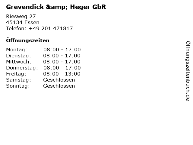 | Öffnungszeiten Grevendick & Heger GbR in Essen anzeigen | |
