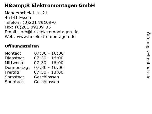 | Öffnungszeiten H&R Elektromontagen GmbH in Essen anzeigen | |