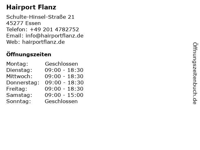 | Öffnungszeiten Hairport Flanz in Essen anzeigen | |