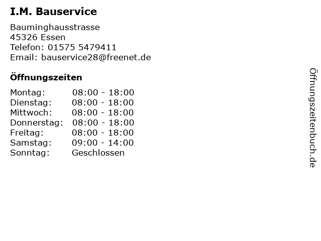 | Öffnungszeiten I.M. Bauservice in Essen anzeigen | |