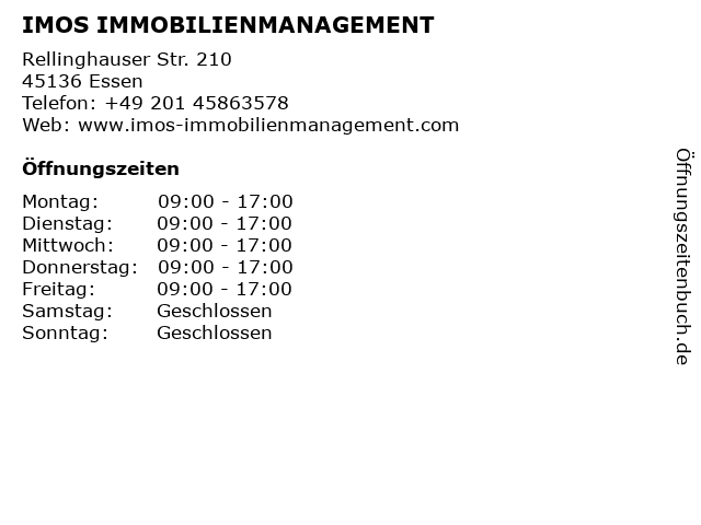 | Öffnungszeiten IMOS IMMOBILIENMANAGEMENT in Essen anzeigen | |