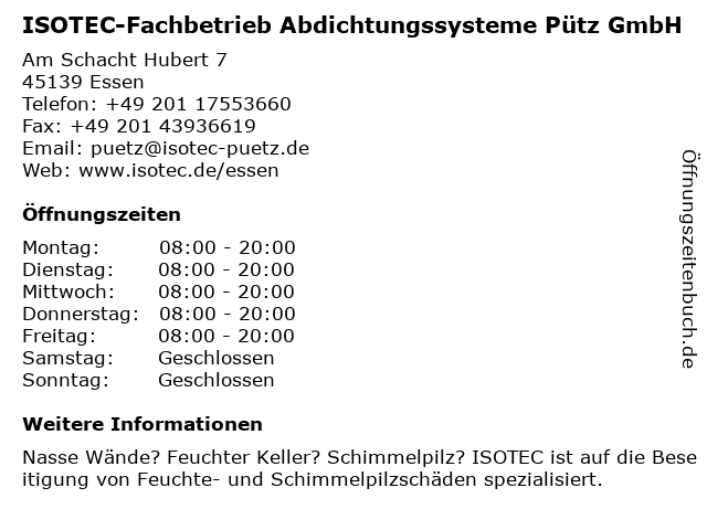 1 ISOTEC-Fachbetrieb Abdichtungssysteme Pütz GmbH (Entfernung: 5,98 km) Elsa-Brandström-Straße 2, 45886 Gelsenkirchen 2 ISOTEC-Fachbetrieb Abdichtungssysteme Pütz GmbH (Entfernung: 12,32 km) Hagenbrockstraße 39b, 46242 Bottrop 3 ISOTEC Fachbetrieb, Abdichtungssysteme Pütz GmbH (Entfernung: 0,00 km) Am Schacht Hubert 7, 45139 Essen 4 ISOTEC Fachbetrieb - Abdichtungssysteme Bobach GmbH & Co. KG (Entfernung: 8,70 km) Hattinger Str. 769, 44879 Bochum 6 ISOTEC-Fachbetrieb Abdichtungssysteme Bobach & Schaub GmbH & Co. KG (Entfernung: 11,52 km) Herner Straße 299, 44809 Bochum |