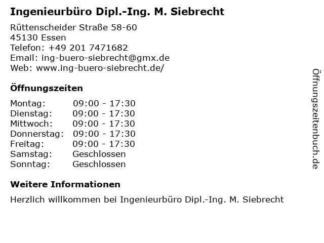 1 Dipl. Ing. Martin Siebrecht Baustatik-Ingenieur (Entfernung: 1,23 km) Richard-Wagner-Str. 47, 45128 Essen 5 Restaurant Haus Siebrecht Inh. Fam. Cosic (Entfernung: 10,28 km) Ückendorfer Str. 183, 45886 Gelsenkirchen 6 |