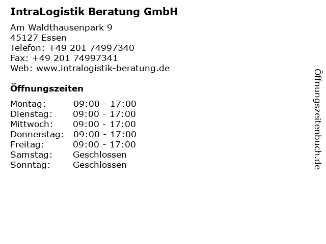 | Öffnungszeiten IntraLogistik Beratung GmbH in Essen anzeigen | |