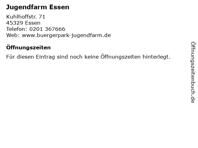 | Öffnungszeiten Jugendfarm Essen in Essen anzeigen | |
