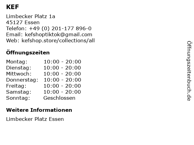 | Öffnungszeiten KEF in Essen anzeigen | |