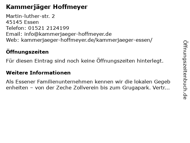 | Öffnungszeiten Kammerjäger Hoffmeyer in Essen anzeigen | |