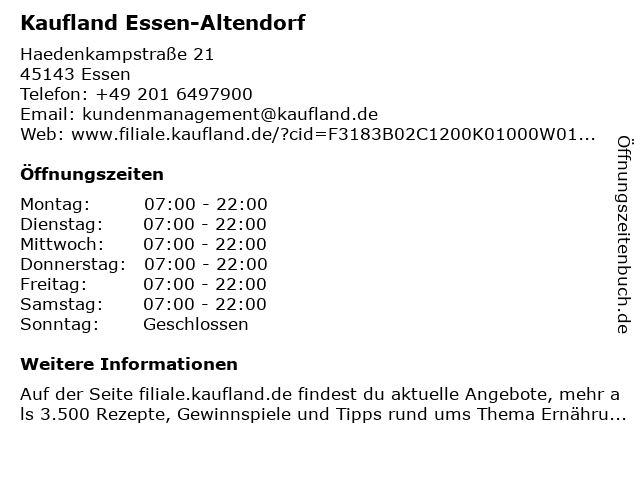 | Öffnungszeiten Kaufland Essen-Altendorf in Essen anzeigen | |