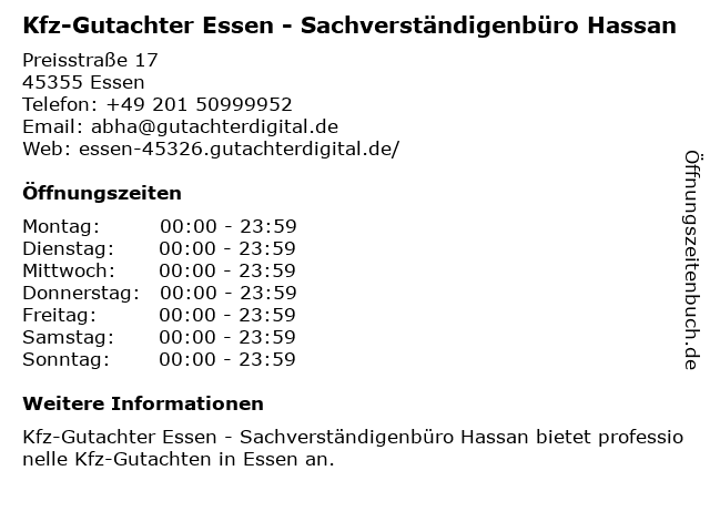 4 KFZ Gutachter & Sachverständigenbüro ANKA Inh. Hatice Küskü (Entfernung: 2,12 km) Heinrich-strunk-strasse 5, 45143 Essen 6 Sachverständigenbüro für Immobilienbewertung Dirk Boscheinen (Entfernung: 2,72 km) Clausewitzstr. 28, 45472 Mülheim |