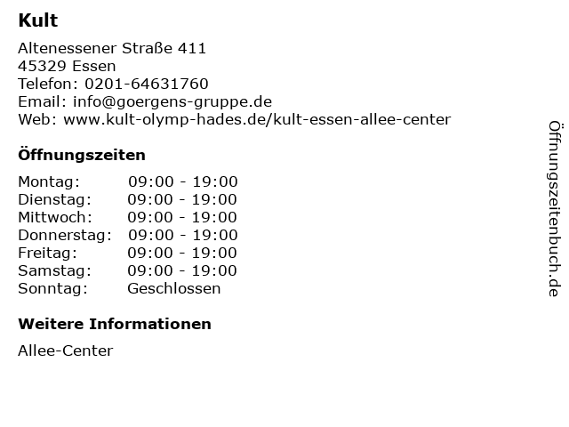 | Öffnungszeiten Kult in Essen anzeigen | |
