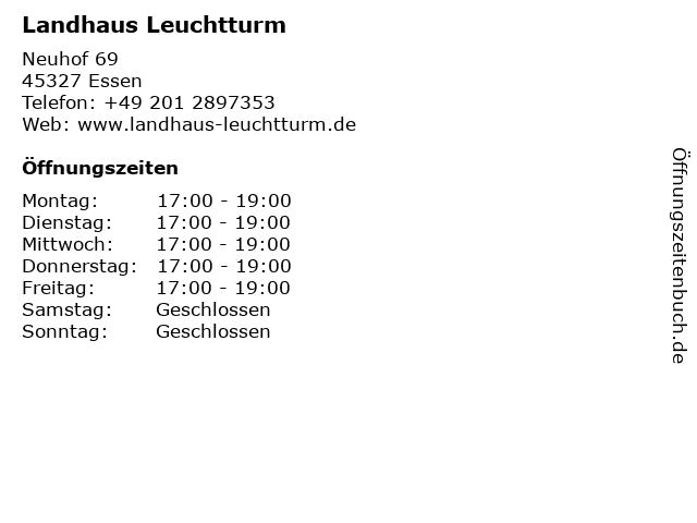 | Öffnungszeiten Landhaus Leuchtturm in Essen anzeigen | |