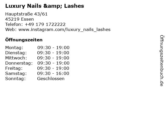 | Öffnungszeiten Luxury Nails & Lashes in Essen anzeigen | |
