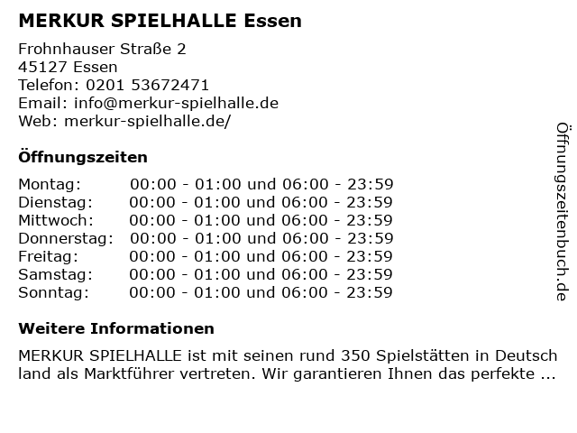 | Öffnungszeiten MERKUR SPIELHALLE Essen in Essen anzeigen | |