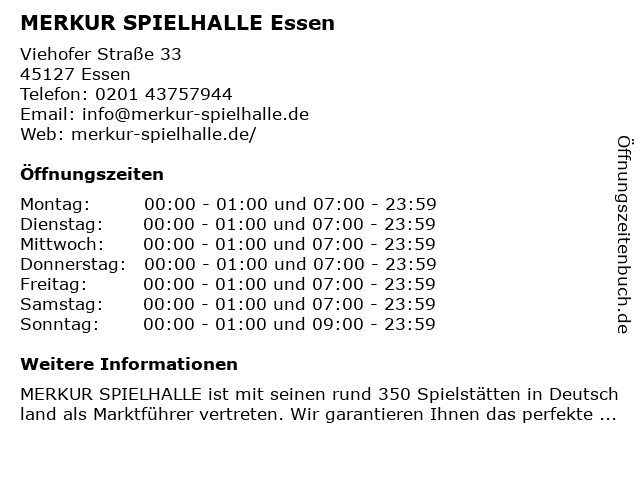 | Öffnungszeiten MERKUR SPIELHALLE Essen in Essen anzeigen | |