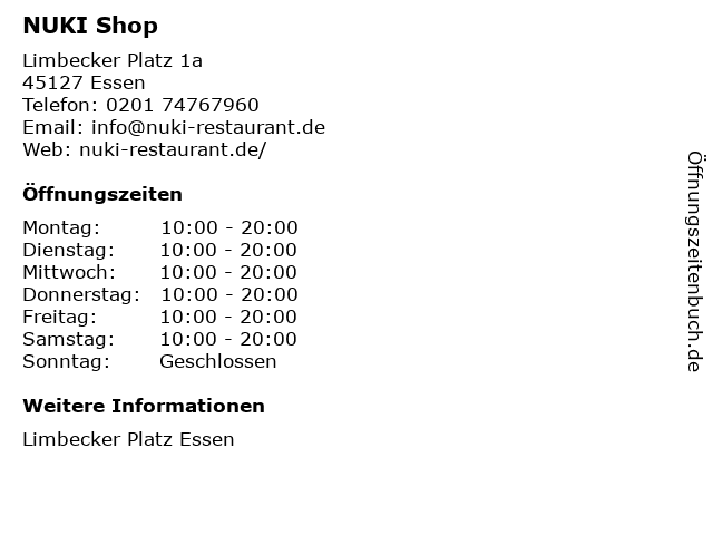 | Öffnungszeiten NUKI Shop in Essen anzeigen | |