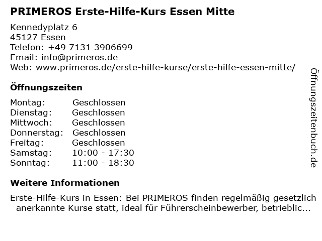 Branchen & Suchbegriffe zu PRIMEROS Erste-Hilfe-Kurs Essen Mitte:erste, erste hilfe am unfallort, erste hilfe kurs, erste-hilfe, erste-hilfe-kurs, essen, führerschein sehtest, herz-lungen-wiederbelebung, herzinfarkt, hilfe, kurs, mitte, primeros, schlaganfall, stabile seitenlage, verbandmaterial, weiterbildung |