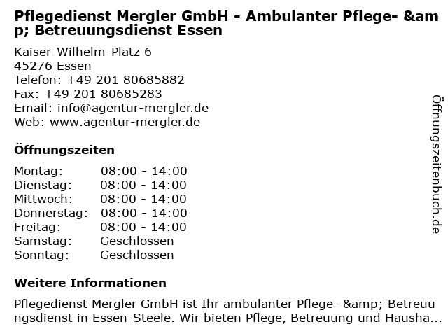 1 Mergler Agentur für Haushaltsnahe Dienstleistungen (Entfernung: 0,04 km) Kaiser-Wilhelm-Platz 6, 45276 Essen 2 Personalservice Pflege-Gesundheit-Dienstleistungen GmbH Zeitarbeit (Entfernung: 0,38 km) Hünninghausenweg 63, 45276 Essen 5 Stationäre Hilfe zur Pflege, Pflegewohngeld, Eingliederungshilfe (Entfernung: 3,52 km) Steubenstr. 53, 45138 Essen 6 |