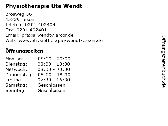 | Öffnungszeiten Physiotherapie Ute Wendt in Essen anzeigen | |