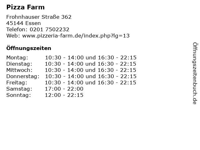 | Öffnungszeiten Pizza Farm in Essen anzeigen | |