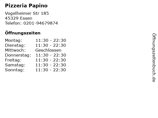 | Öffnungszeiten Pizzeria Papino in Essen anzeigen | |