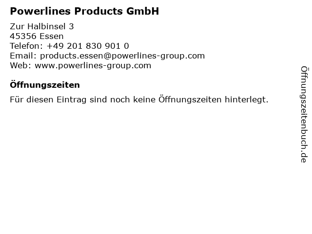 | Öffnungszeiten Powerlines Products GmbH in Essen anzeigen | |