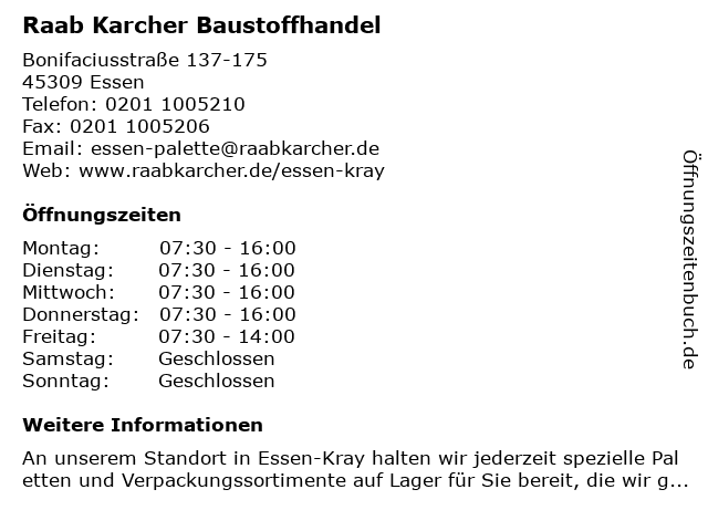| Öffnungszeiten Raab Karcher Baustoffhandel in Essen anzeigen | |