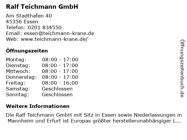 | Öffnungszeiten Ralf Teichmann GmbH in Essen anzeigen | |