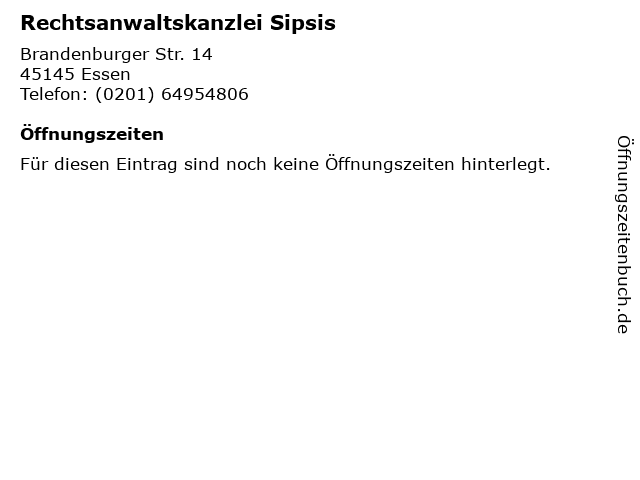 | Öffnungszeiten Rechtsanwaltskanzlei Sipsis in Essen anzeigen | |