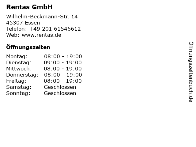 | Öffnungszeiten Rentas GmbH in Essen anzeigen | |