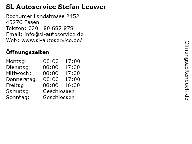 | Öffnungszeiten SL Autoservice Stefan Leuwer in Essen anzeigen | |