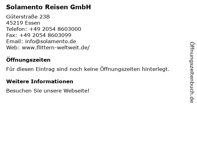 | Öffnungszeiten Solamento Reisen GmbH in Essen anzeigen | |