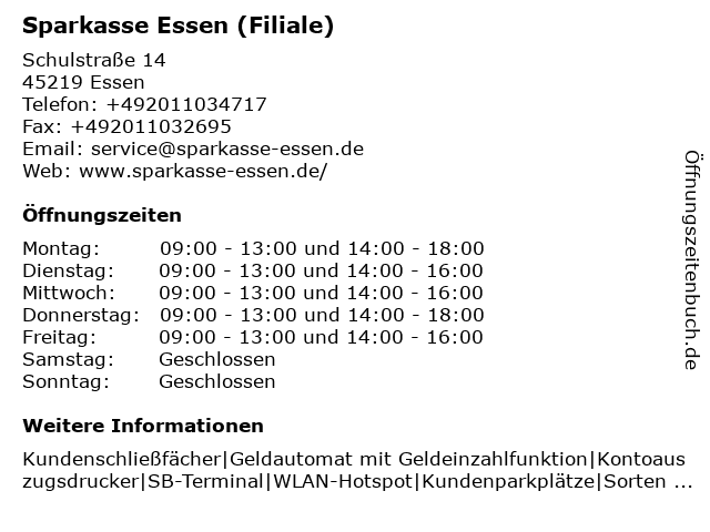 | Öffnungszeiten Sparkasse Essen (Filiale) in Essen anzeigen | |