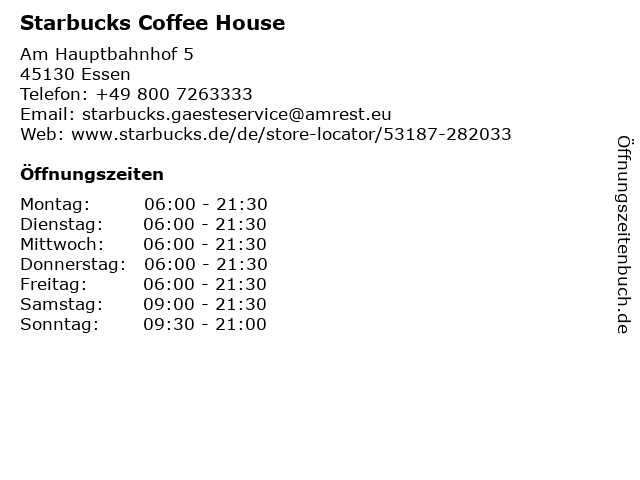| Öffnungszeiten Starbucks Coffee House in Essen anzeigen | |