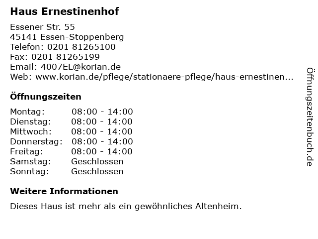| Öffnungszeiten Haus Ernestinenhof in Essen-Stoppenberg anzeigen | |