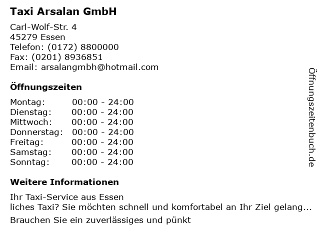 | Öffnungszeiten Taxi Arsalan GmbH in Essen anzeigen | |