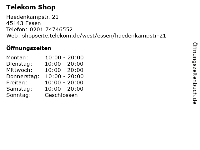 | Öffnungszeiten Telekom Shop in Essen anzeigen | |