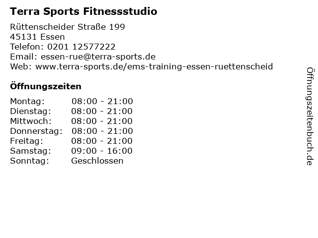 | Öffnungszeiten Terra Sports Fitnessstudio in Essen anzeigen | |