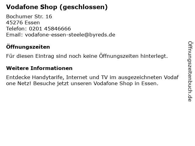 | Öffnungszeiten Vodafone Shop (geschlossen) in Essen anzeigen | |