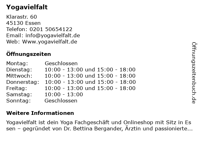 Öffnungszeiten Yogavielfalt in Essen anzeigen | |