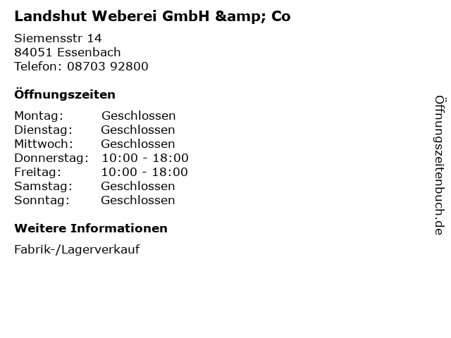 | Öffnungszeiten Landshut Weberei GmbH & Co in Essenbach anzeigen | |