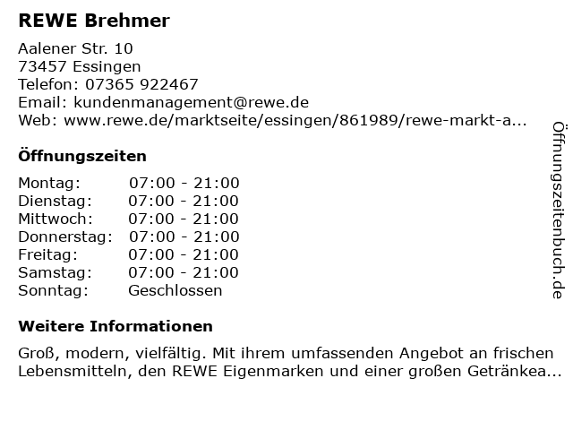 | Öffnungszeiten REWE Brehmer in Essingen anzeigen | |