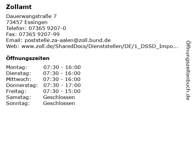 | Öffnungszeiten Zollamt in Essingen anzeigen | |