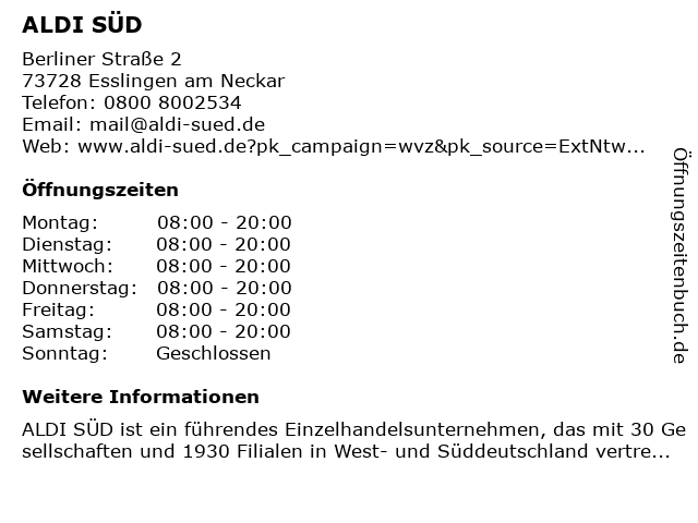 | Öffnungszeiten ALDI SÜD in Esslingen am Neckar anzeigen | |