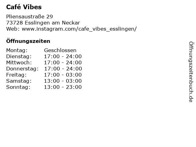 | Öffnungszeiten Café Vibes in Esslingen am Neckar anzeigen | |