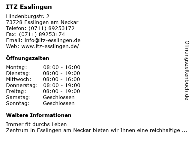 | Öffnungszeiten ITZ Esslingen in Esslingen am Neckar anzeigen | |