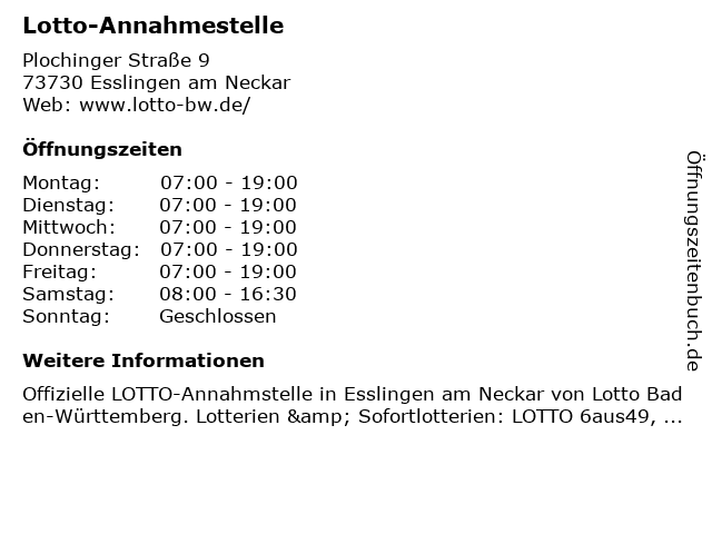 | Öffnungszeiten Lotto-Annahmestelle in Esslingen am Neckar anzeigen | |