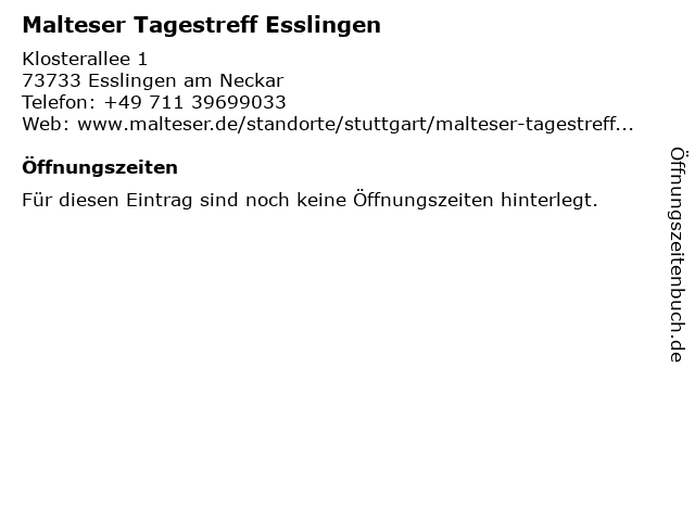 2 Malteser Stadtgeschaeftsstelle Esslingen (Entfernung: 0,01 km) Klosterallee , 73733 Esslingen am Neckar 6 |