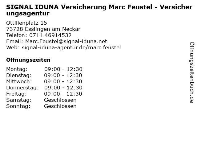 1 SIGNAL IDUNA Versicherung Adnan Tatlici - Versicherungsagentur (Entfernung: 0,00 km) Ottilienplatz 15, 73728 Esslingen am Neckar 2 Adnan Tatlici Generalagentur Region Esslingen SIGNAL IDUNA Gruppe (Entfernung: 0,17 km) Kiesstr. 7, 73728 Esslingen 3 SIGNAL IDUNA Versicherung Matthias Wörner - Versicherungsagentur (Entfernung: 1,12 km) Kandlerstr. 11, 73728 Esslingen am Neckar 5 SIGNAL IDUNA Versicherung Regina Abele - Versicherungsagentur (Entfernung: 2,14 km) Braungartweg 5, 73734 Esslingen 6 SIGNAL IDUNA - Bezirksdirektion Marc Florian Carrle (Entfernung: 3,88 km) Bettina-von-Arnim-Straße 5, 73760 Ostfildern |