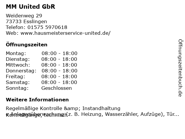 | Öffnungszeiten MM United GbR in Esslingen anzeigen | |